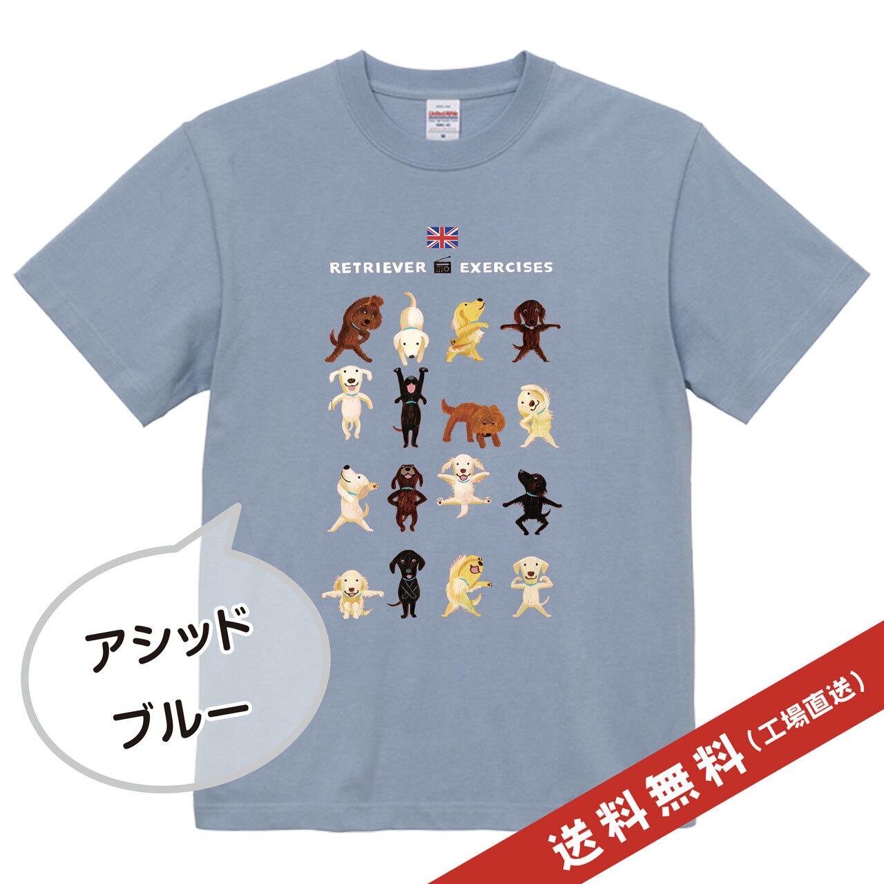 色んなレトリバーたち(ゴールデン、ラブラドール、フラットコーテッド、ドゥードゥル)が楽しく体操しているイラストTシャツです♫