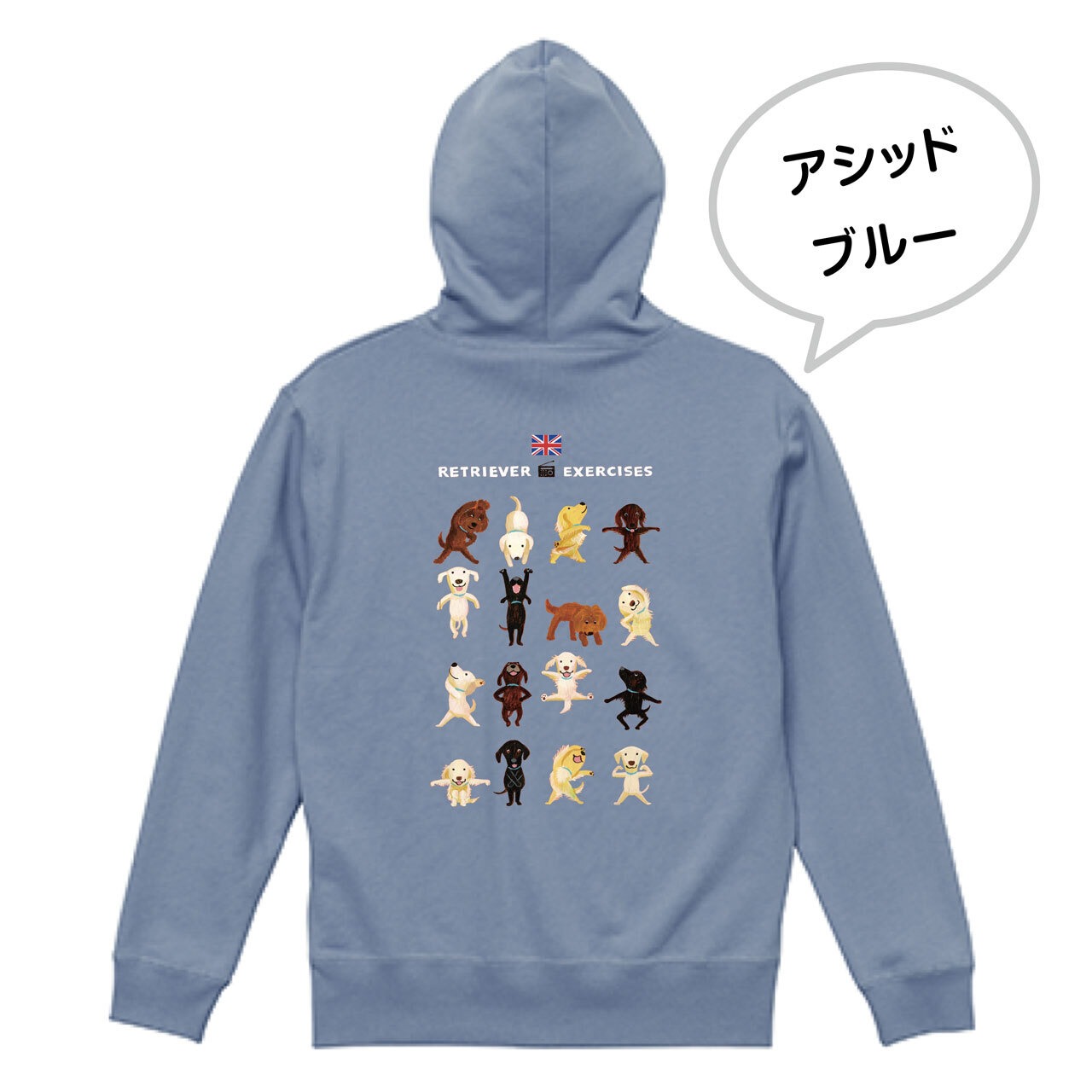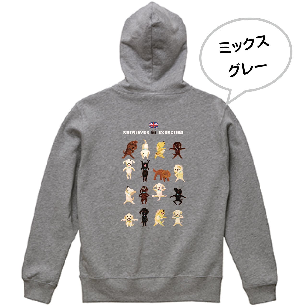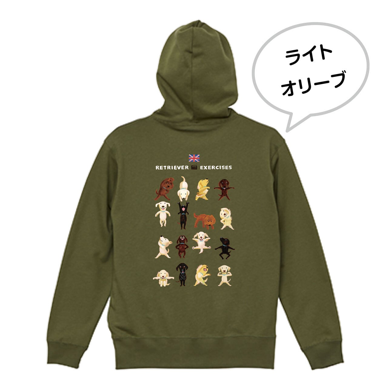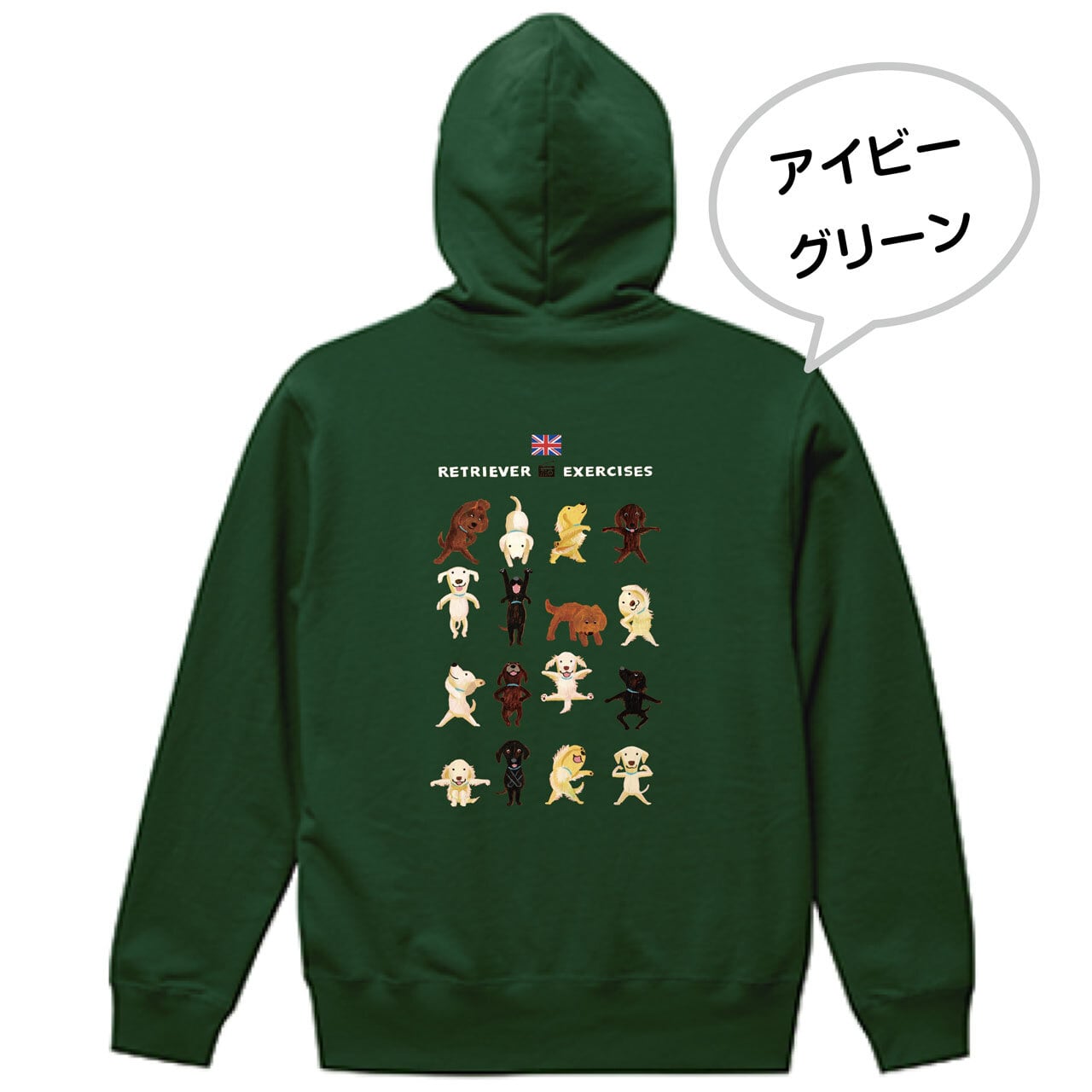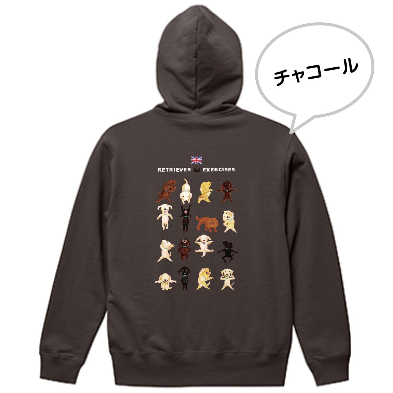 レトリバーさんたちが元気いっぱい楽しく体操しているイラストが背中に入った、春まで活躍してくれるパイル地のフルジップ・パーカーです♫