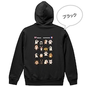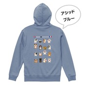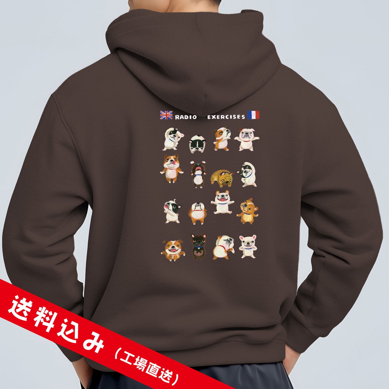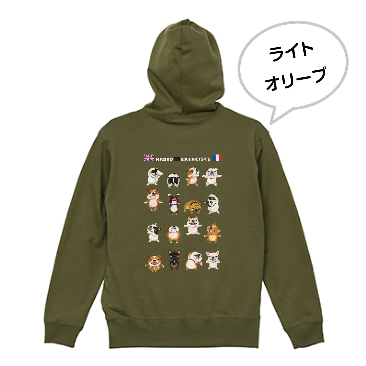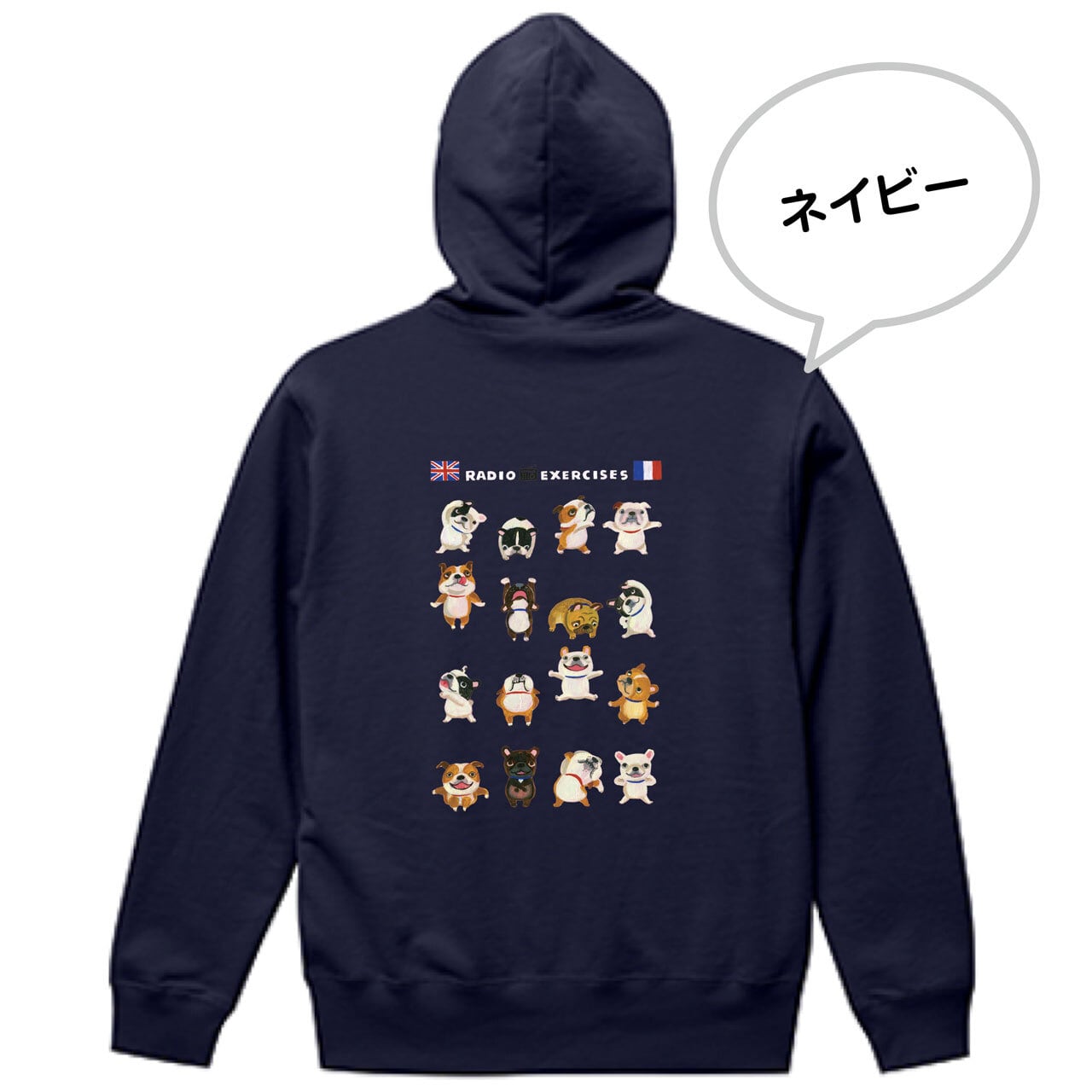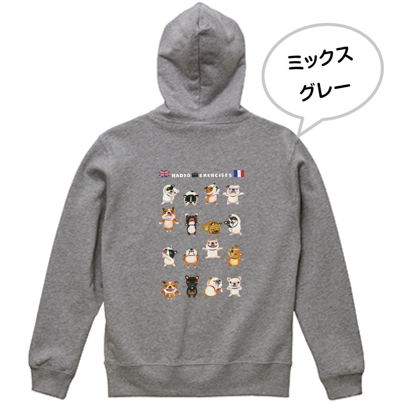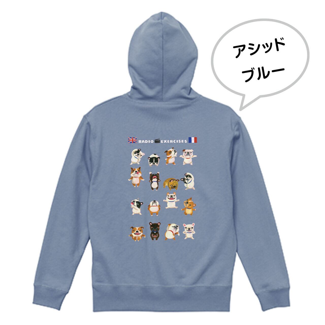ブルドッグさんたち(フレンチ/イングリッシュ)が元気いっぱい楽しく体操しているイラストが背中に入った、春まで活躍してくれるパイル地のフルジップ・パーカーです♫