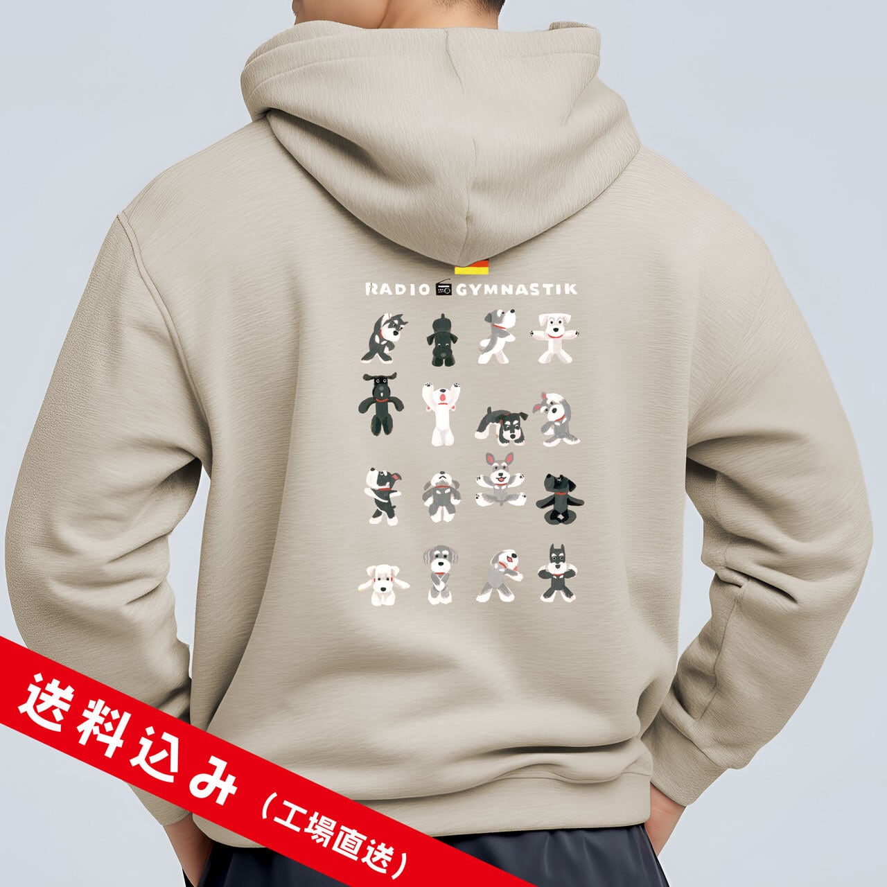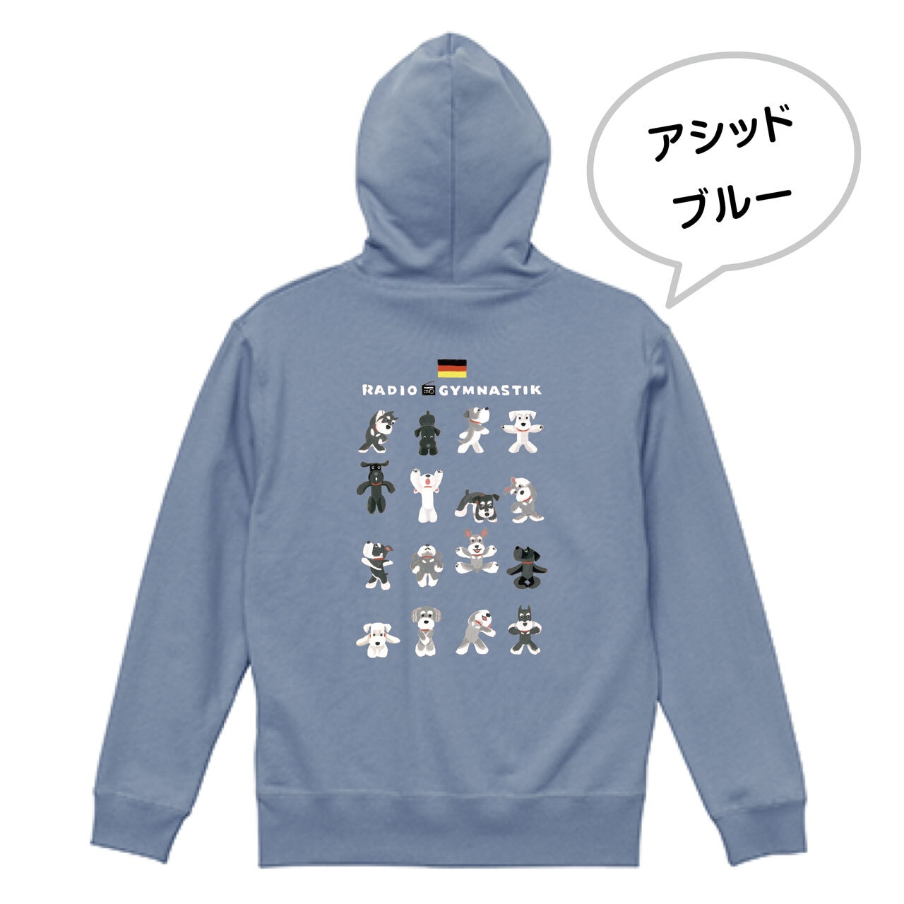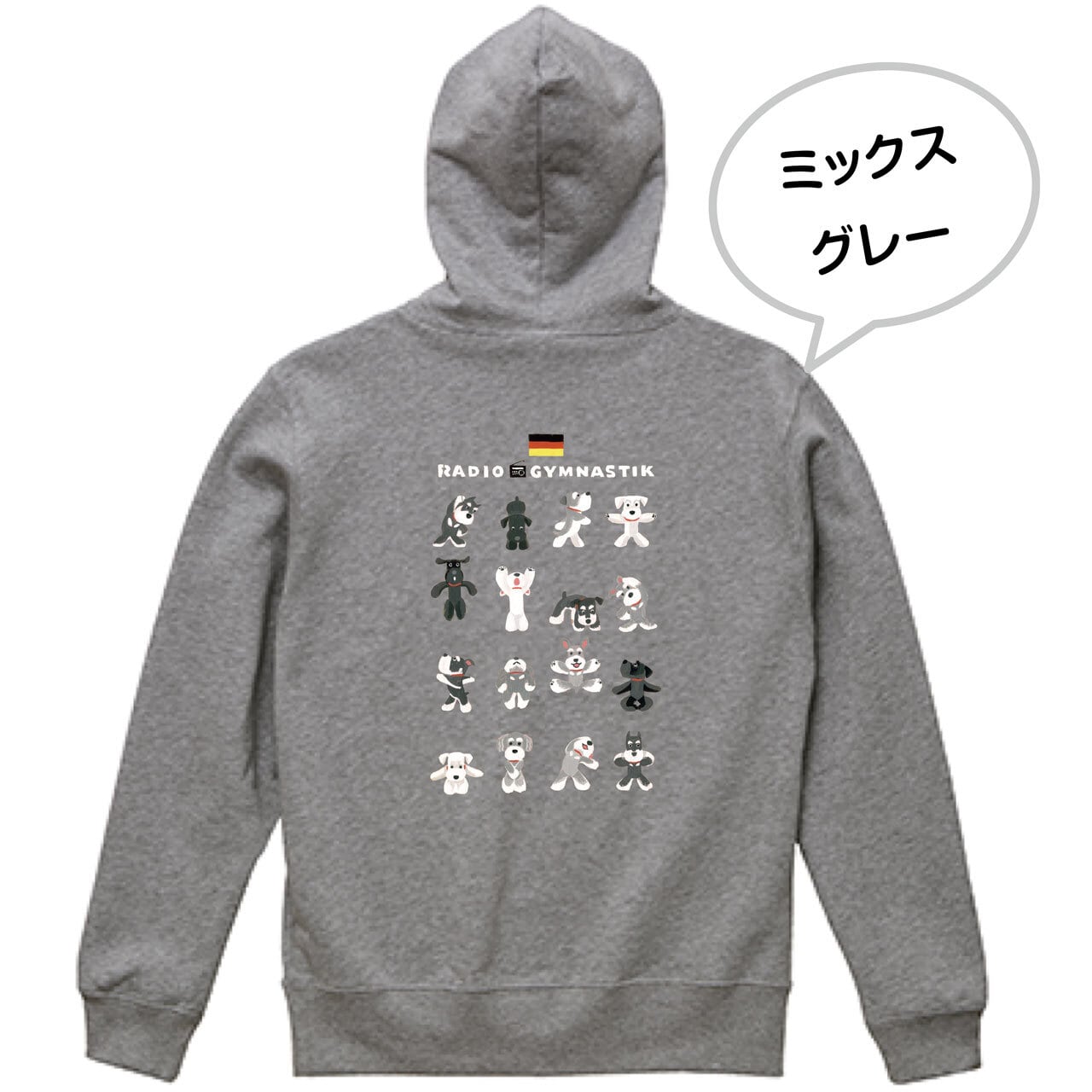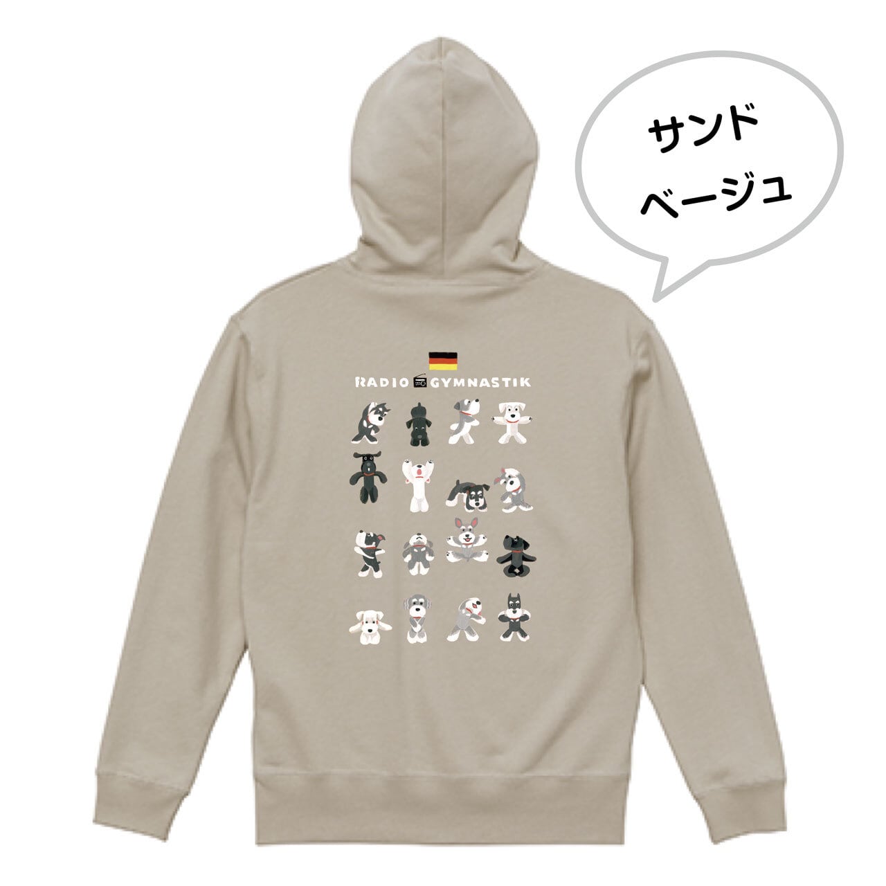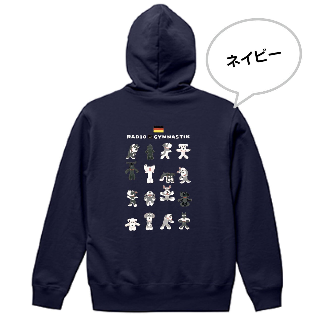 シュナウザーさんたちが元気いっぱい楽しく体操しているイラストが背中に入った、春まで活躍してくれるパイル地のフルジップ・パーカーです♫