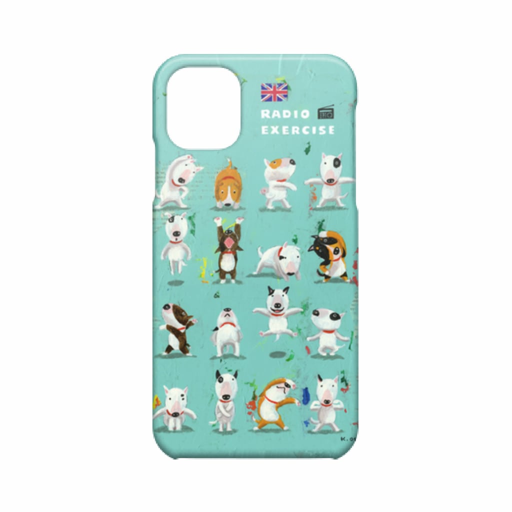 色んなタイプのブルテリアがラヂオ体操をしている楽しいデザインのスマホケース(カバータイプ)です。